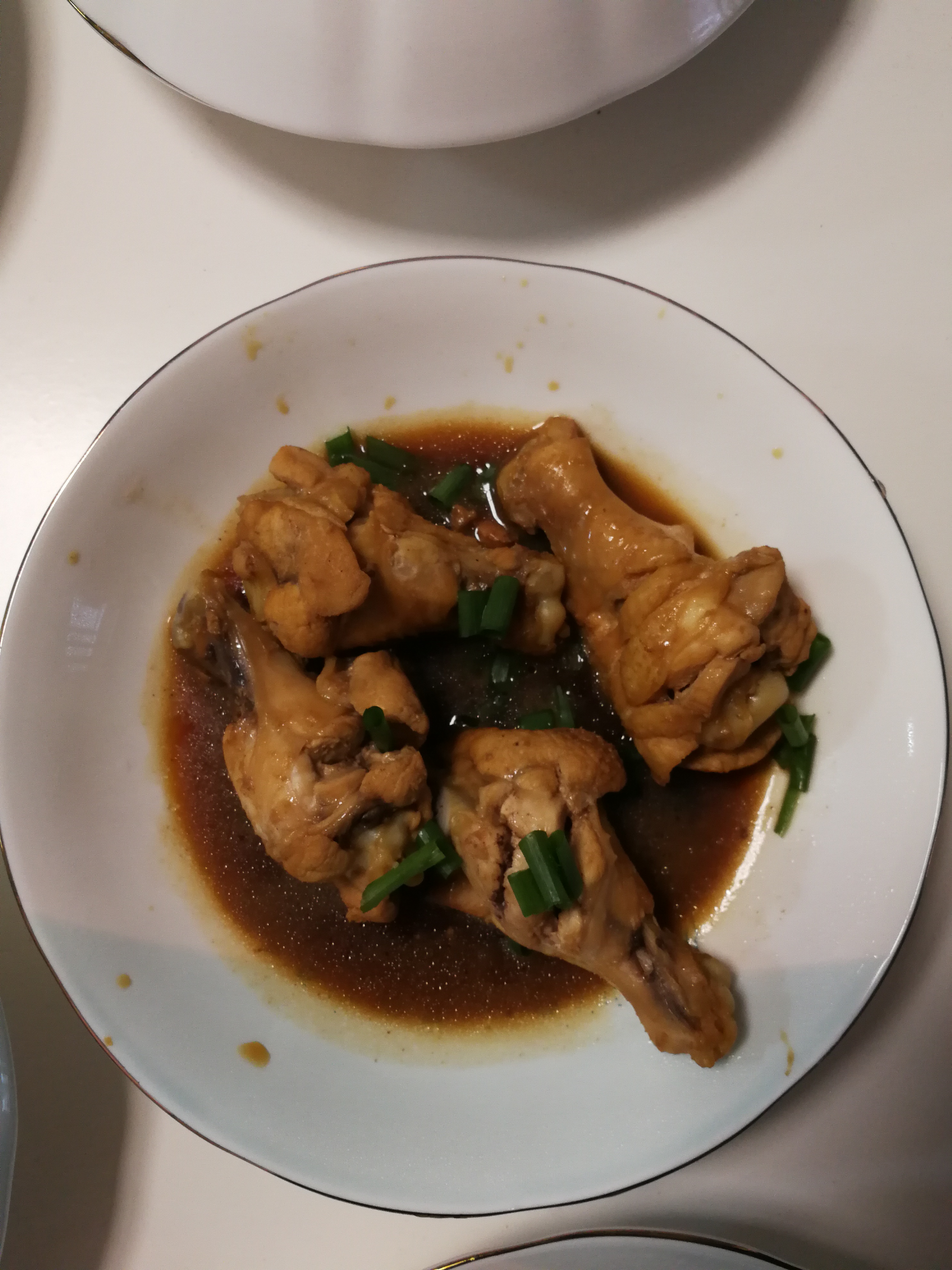- 锅中加入适量水,烧开,加入蒜、姜、料酒、糖、老抽和鸡腿(水刚好没过鸡腿)